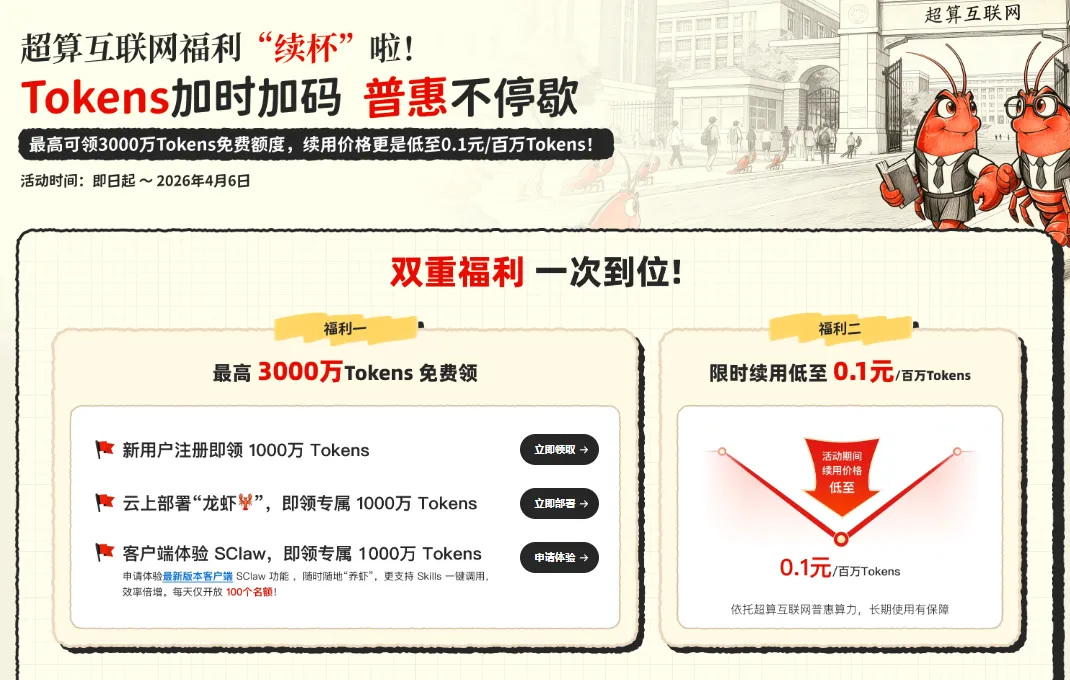 4月6日之前,注册就送1000w Token,目前我领到的模型是MiniMax-2.5,而且还能一键部署小龙虾。