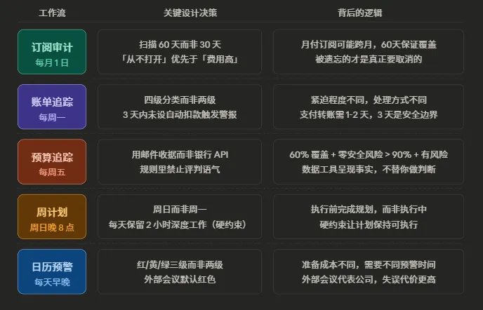 五个工作流看下来,设计决策的模式是一致的:时间窗口的选择基于真实的业务逻辑、分类方式对应不同的行动要求、硬性约束保护你的核心资源、数据来源在安全和便利之间取权衡。