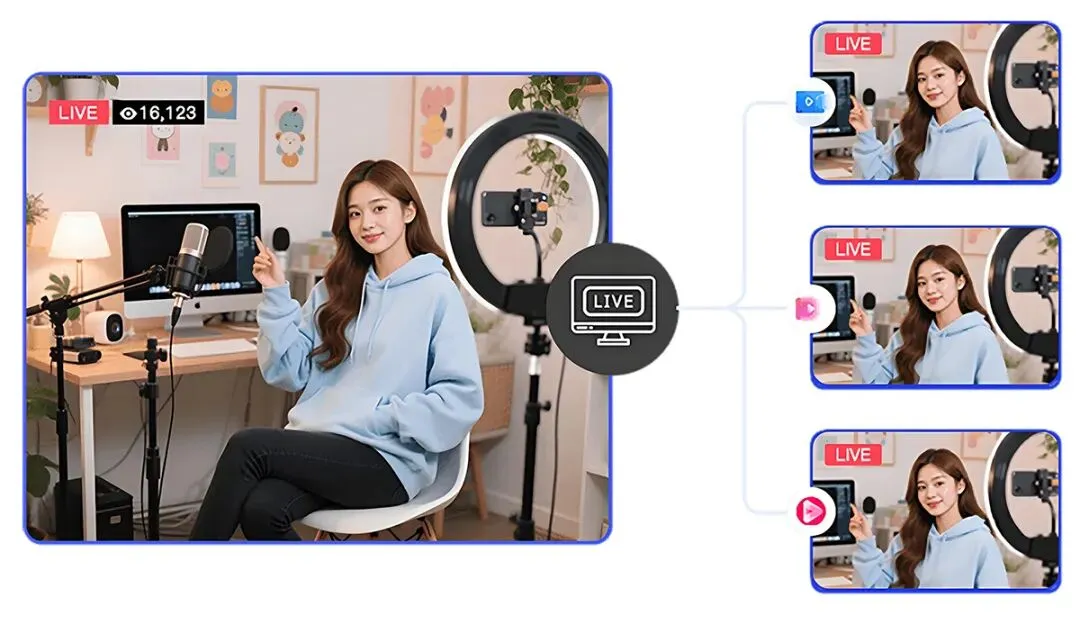 第五步 添加完成各平台的推流码后,点击白色的小圆圈,即可开启多平台推流直播