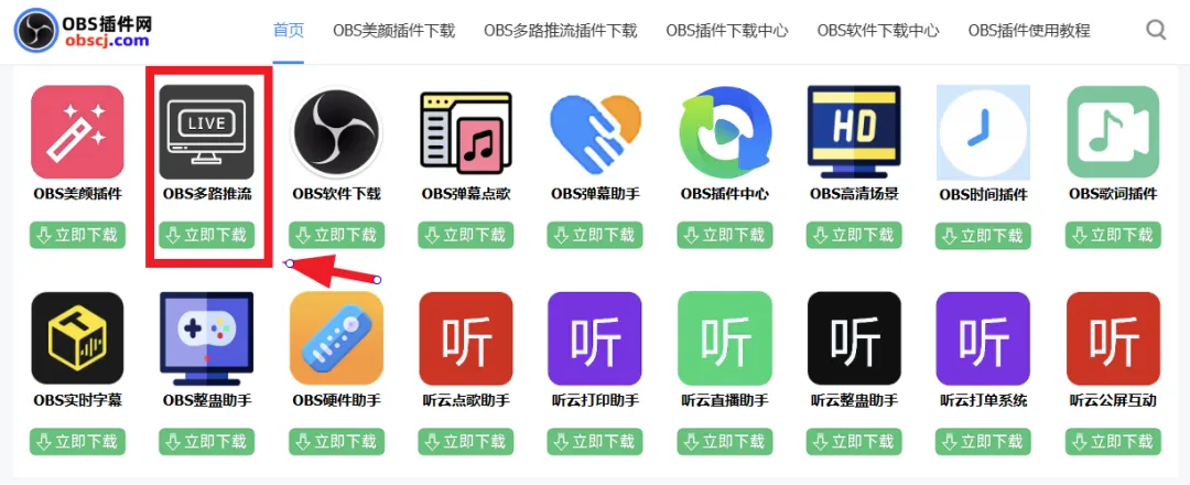 除了上述两个下载地址,还可以直接访问【OBS插件网】官方网站:obscj.com 去下载,如下图所示,查看红色箭头所指的位置,然后点击绿色按钮【立即下载】即可