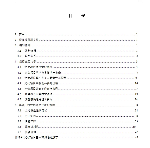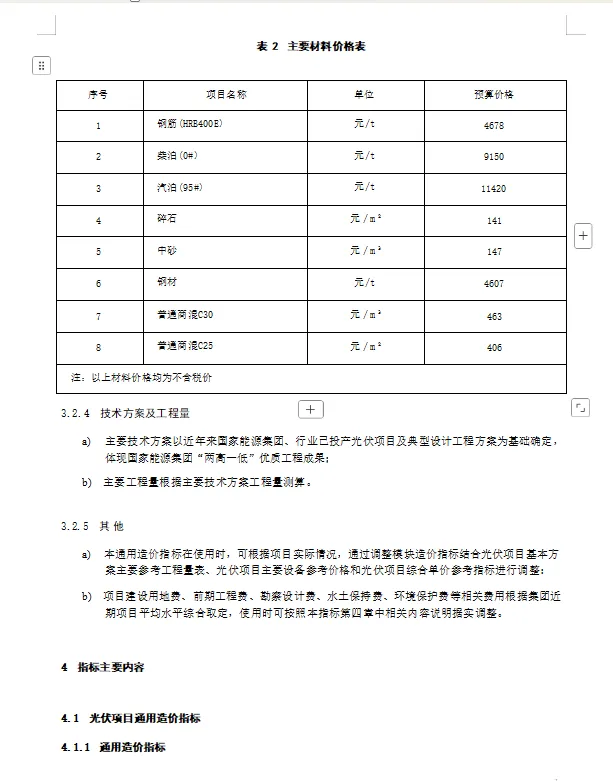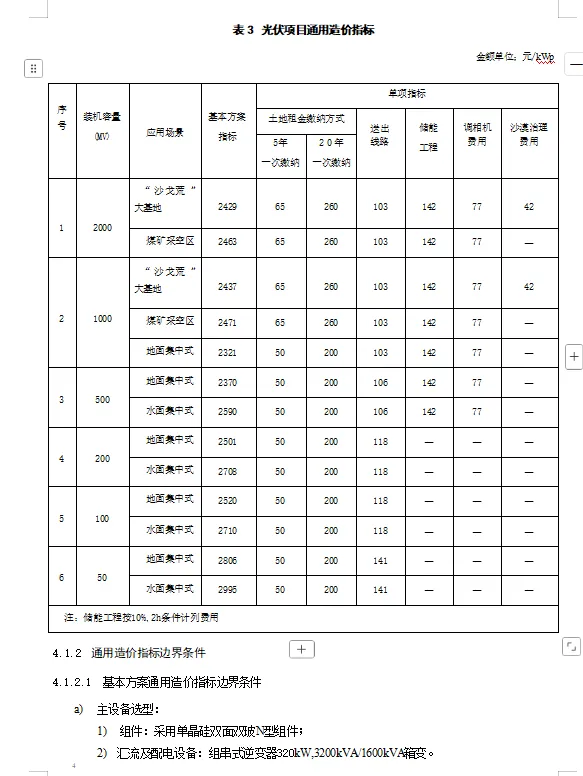 本指标执行NB/T32027—2016《光伏发电工程设计概算编制规定及费用标准》,定额参考NB/T32035—2016《光伏发电工程概算定额》,不足部分参考《电力工程建设概算定额》(2018年版),其他相关费用标准执行《建筑业营业税改征增值税后光伏发电工程计价依据调整实施意见》(可再生定额(201661号)、《关于调整水电工程、风电场工程及光伏发电工程计价依据中建筑安装工程增值税税率及相关系数的通知》(可再生定额〔2019〕14号)、《关于调整水电工程、风电场工程及光伏发电工程计价依据中安全文明施工措施费费用标准的通知》(可再生定额〔2022)39号〕,