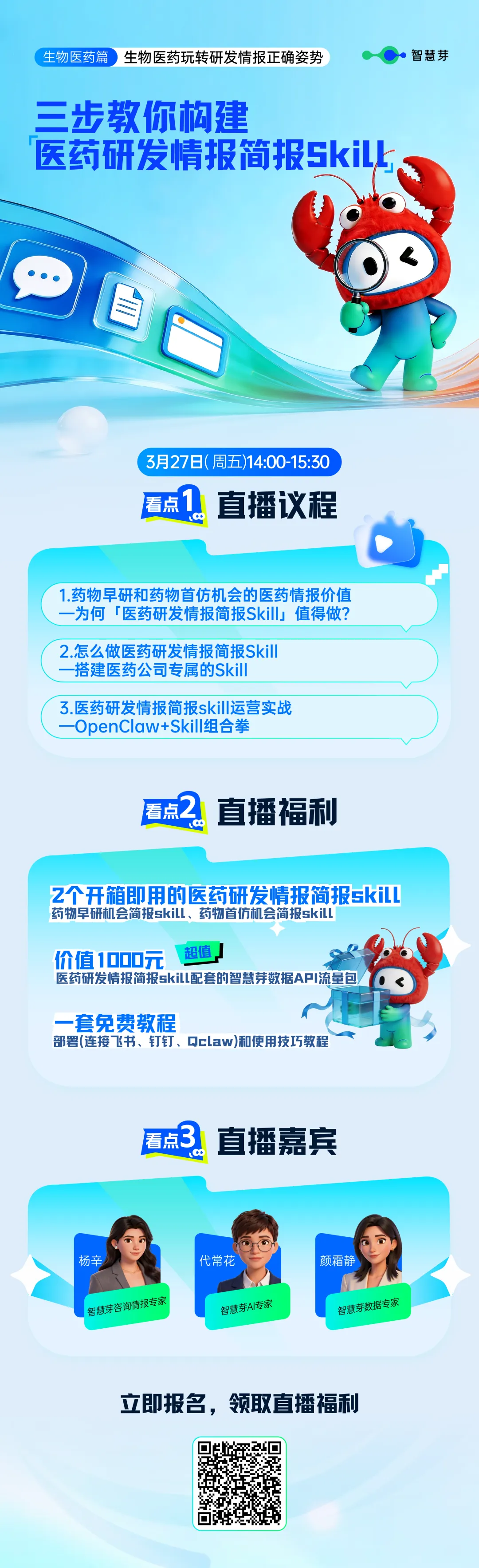 3月27日(本周五),智慧芽《三步教你构建医药研发情报简报Skill》超级直播间,只聚焦一件事:手把手教你用OpenClaw+Skill,把你团队的医药研发情报响应速度,从“周”压缩到“天”,甚至“小时”。