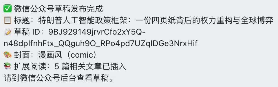 10 秒左右,一篇草稿就出现在公众号后台了,你可以立即预览,确认格式没问题。
