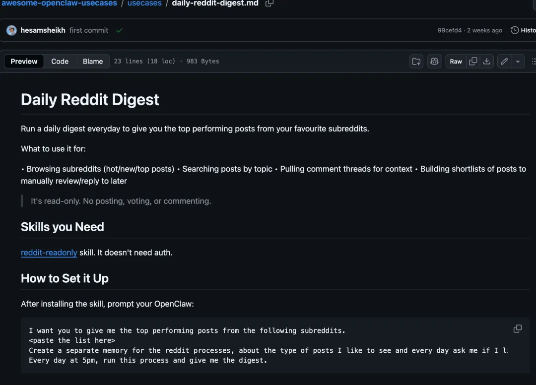 打开这个开源项目https://github.com/hesamsheikh/awesome-openclaw-usecases,我们可以看到 usecases 下有很多 .md文件: