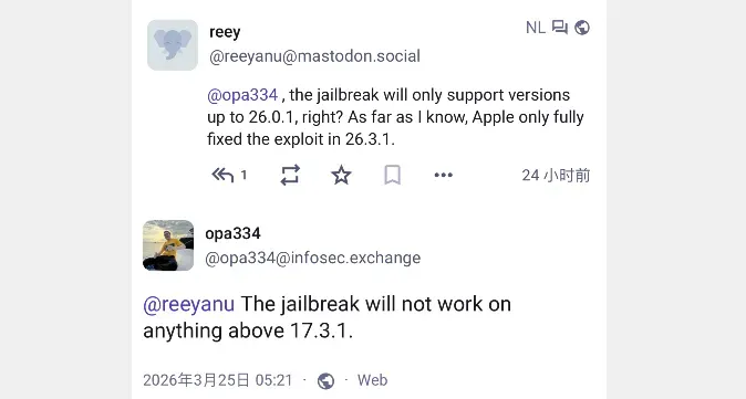 关于 iOS 26.0.1 能否实现越狱的问题,opa334 越狱大佬回应,想实现越狱,最高支持 iOS 17.3.1 系统,大于该系统将无法工作。