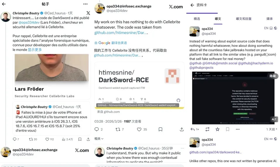好事是 opa334 公开了 DarkSword 漏洞,坏事是他因此遭到多名开发者或博主指责,认为其不应公开 DarkSword 漏洞利用代码,可能会被不法分子滥用。随后,他还被 GitHub 警告开源代码存在风险问题。