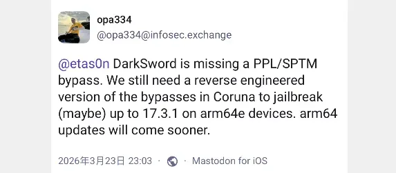 opa334 大佬也透露目前 DarkSword 越狱进展和限制,告诉我们 DarkSword 缺少 PPL/SPTM bypass,想在 arm64e 机型上实现 iOS 17.3.1 及以下版本的越狱,还需要逆向出 Coruna 工具里的 bypass 技术。