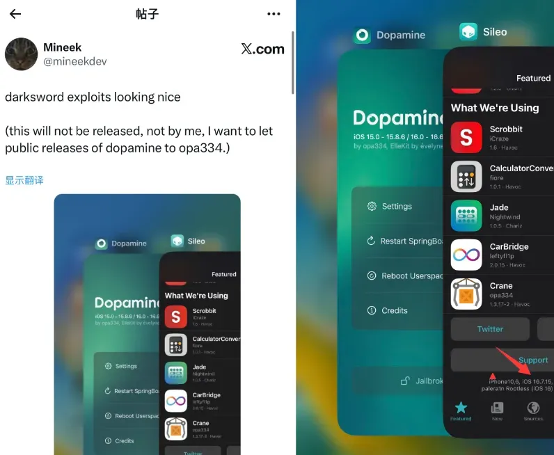 目前 Mineek 大佬已经实测,利用 DarkSword 漏洞在 iPhone X iOS 16.7.15 上实现越狱,意味着此漏洞是有效可用于越狱,opa334 大佬提到,最早也是 iPhone X 及较旧的设备发布越狱支持。