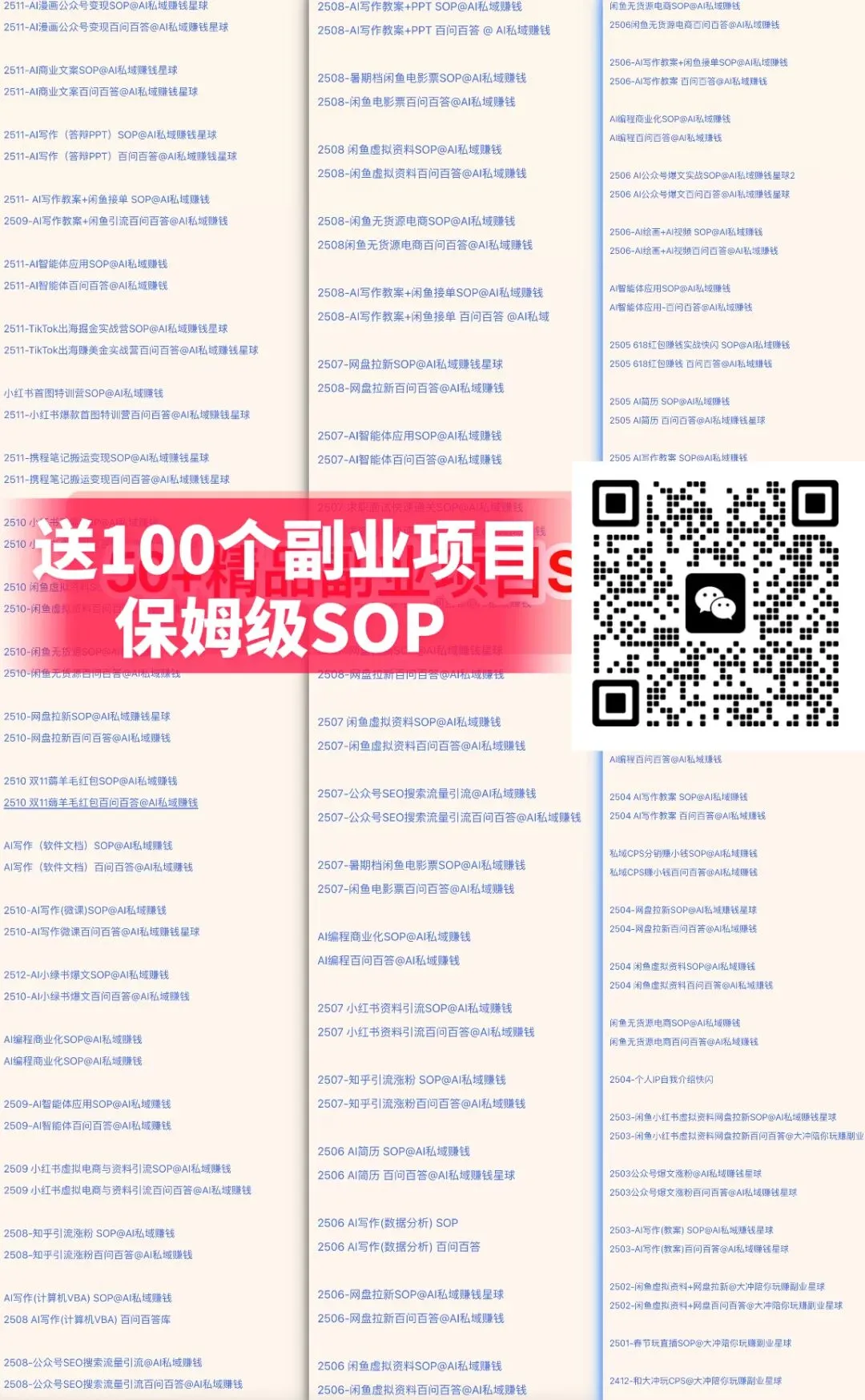 送100个副业实战项目SOP教程,可自学,赚小钱像呼吸一样简单。