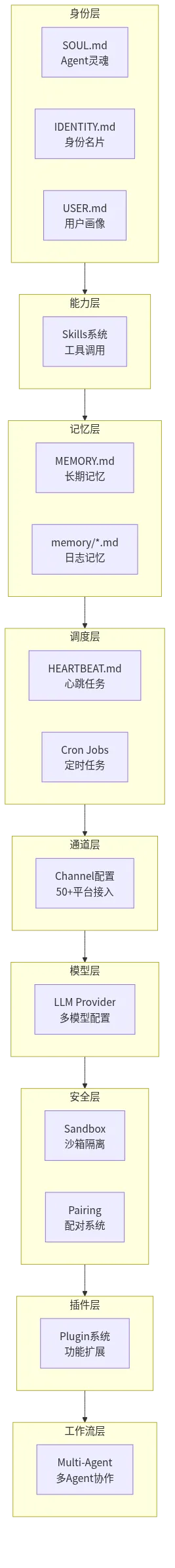 OpenClaw的架构可拆解为9个层次,每一层都决定了Agent的某一方面特性: