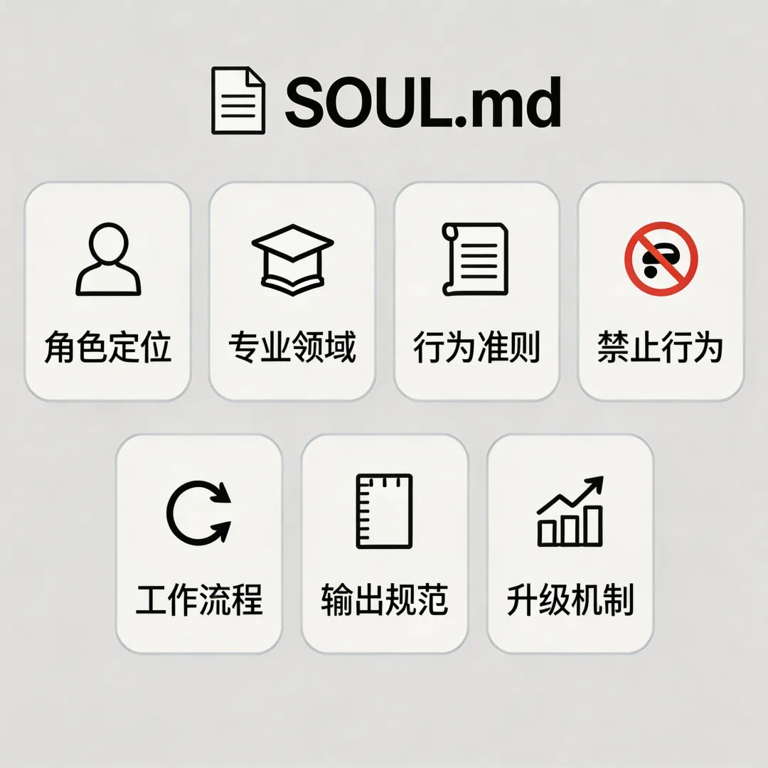 • 认知边界(SOUL.md):让它知道自己是谁、该说什么