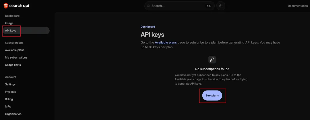 点击“开始使用*”,然后你注册一个账号。他会给你发一封验证邮件,你点击邮件里的链接通过验证,然后就可以登录了。登录后点击左侧的“API keys”,它会提示你,你必须订阅他的 plan,才能创建 key。