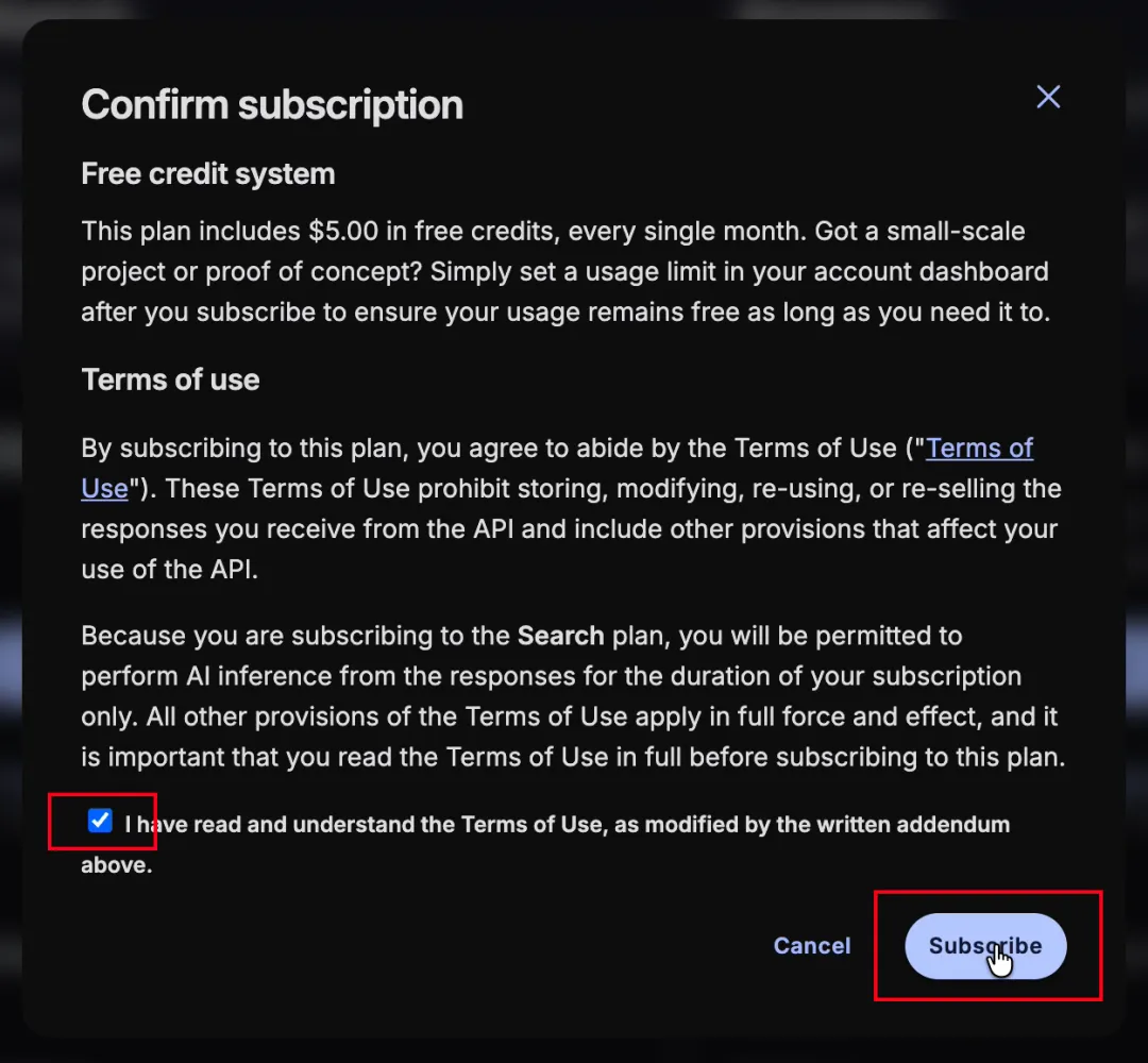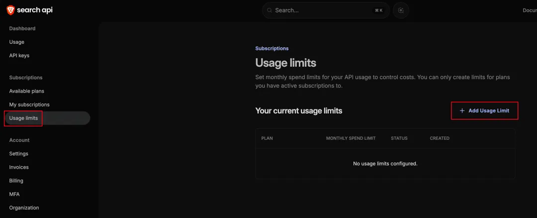 Brave 是 OpenClaw 较早就开始支持的,需要绑定信用卡才能开通 API 权限,不过每月有$5的免费额度,可以调用1000次。并且你可以通过设置一个$5的使用限额来避免超额扣费。