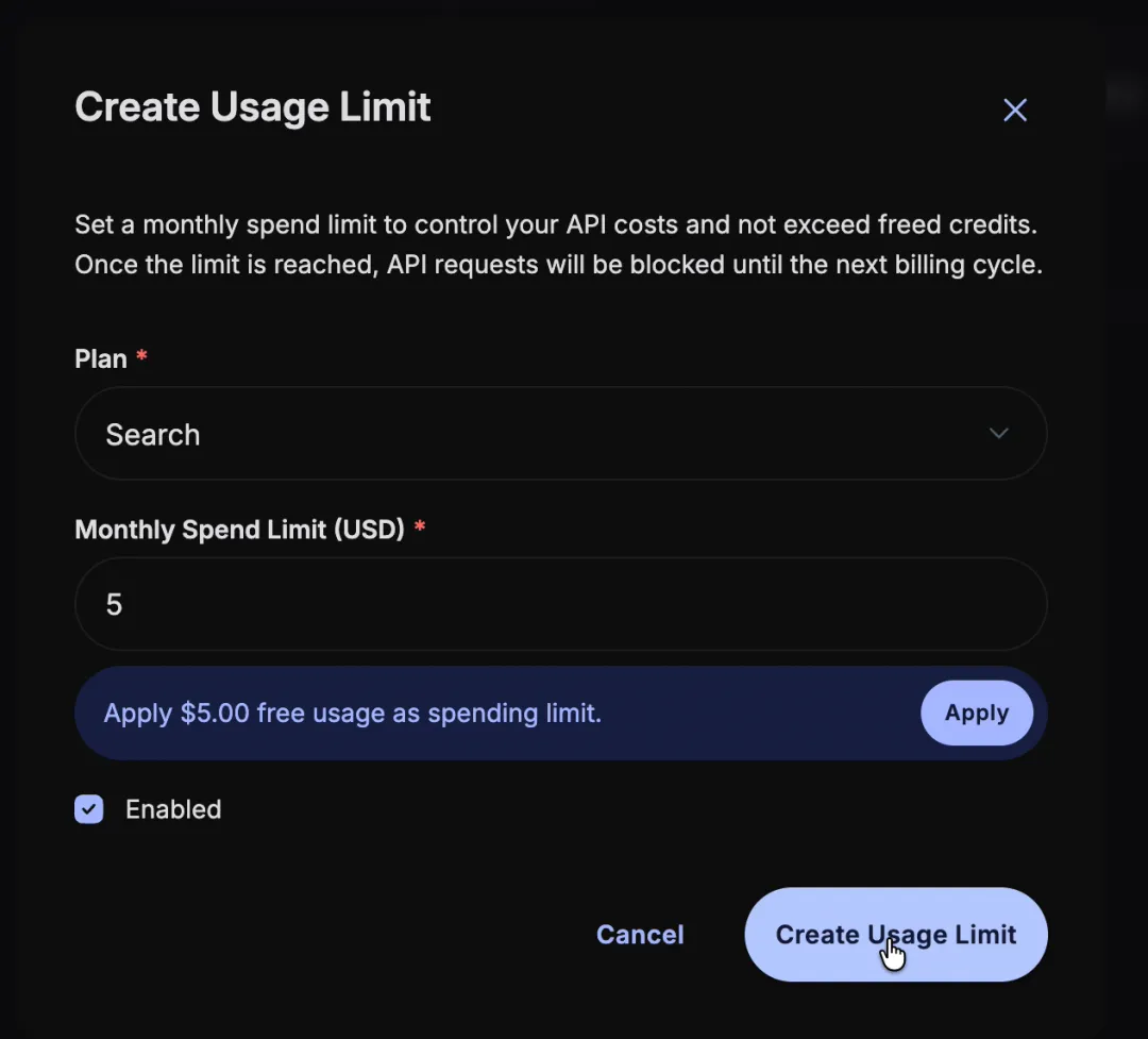 创建好后,注意,要添加一个用量限制,点击左侧 Usage limits,然后添加一个$5的用量限制,这样你每个月就不会超过它$5的免费额度了。