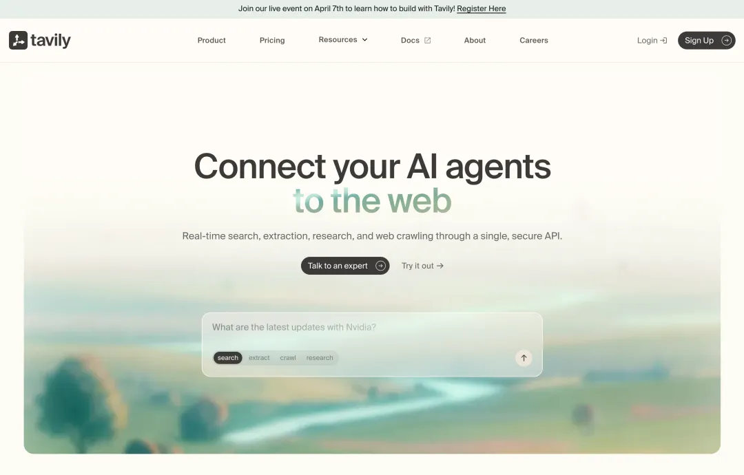 Tavily 就简单多了,打开网站 https://www.tavily.com/