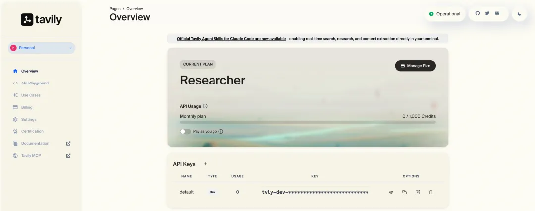 Tavily 是最近版本才支持的,如果你去年就开始玩智能体了,对它应该不会陌生,无需绑定信用卡,注册后就能享受每月1000次免费调用额度。