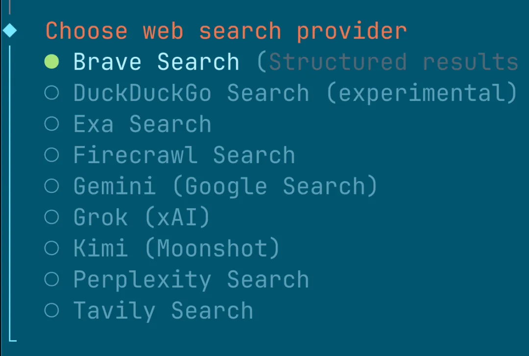 获取完 key 之后,回到终端,使用命令openclaw configure --section web可以配置搜索引擎,执行后,依次选择“Local”,“Yes”,“Brave Search”。