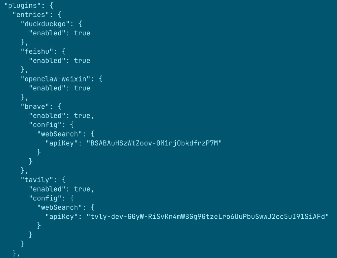 在刚才的配置中,搜索引擎的 key 都被写在了主配置文件,我们打开~/.openclaw/openclaw.json可以看到:
