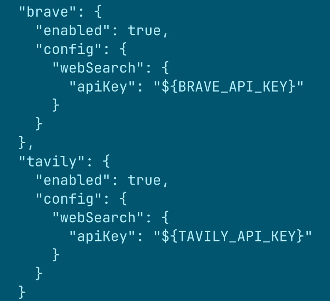 所以 OpenClaw 提供了另一种保存 key 的方法,就是把 key 保存到环境变量,然后在配置文件中只是引用环境变量。因此,我们可以把上面搜索引擎的配置改为: