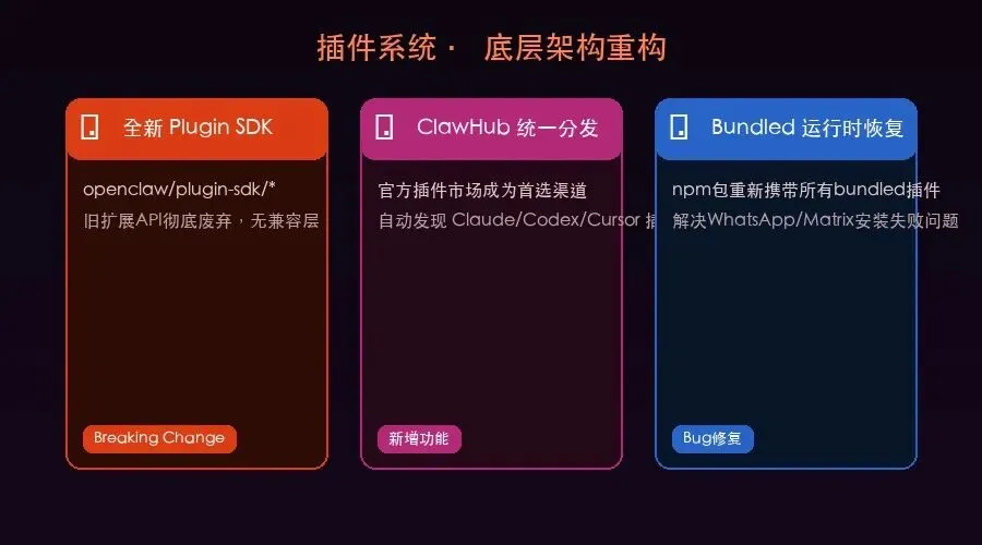 ⚠️ 升级注意:如果你安装了旧版第三方插件,升级后这些插件将无法运行,需要等插件作者适配新 SDK 或通过 ClawHub 重新安装。