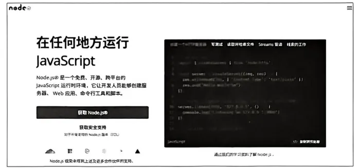 (2)在官网首页,单击左侧的“获取Node.js”按钮,进入Node.js安装包的下载页面。
