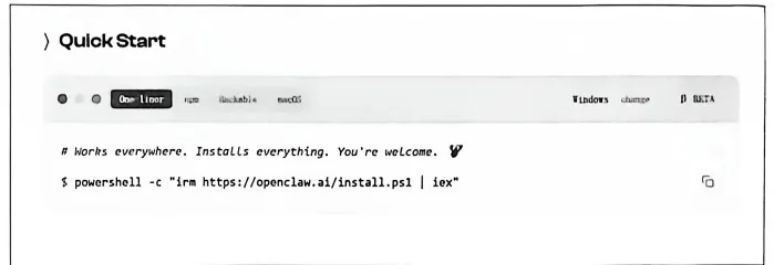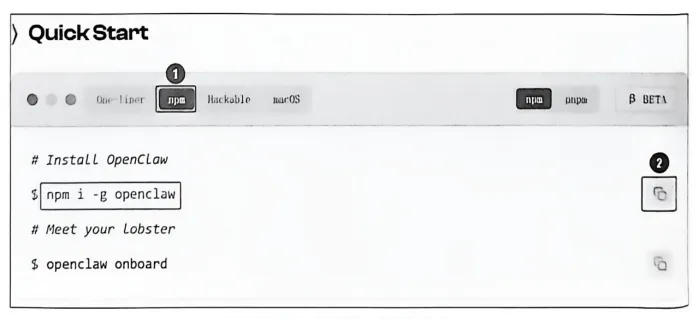在官网“QuickStart”中选择“npm”,然后复制第一条安装命令(作用是安装OpenClaw工具本身),如图3-25所示。