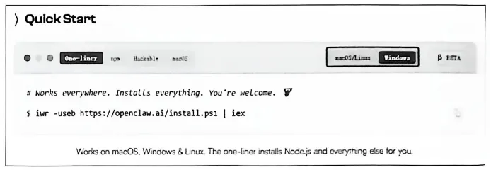 进入OpenClaw官网后,你会看到“Quick Start”(快速入门)里面列出了不同的安装方式,如图3-19所示。