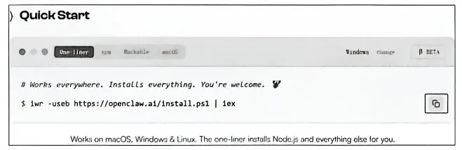 完成系统环境准备后,我们就可以开始安装OpenClaw了。首先访问OpenClaw官网获取安装命令,官网如图3-18所示。