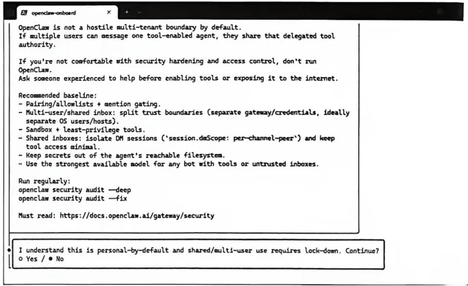 安装成功后,我们需要执行初始配置命令,让OpenClaw了解你的偏好和使用环境。这个过程中会有一些风险提示并需要做相应选择,我们一步步来做。