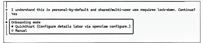 OpenClaw官方提供了两种核心模式。针对零基础养“龙虾”的用户,“QuickStart”模式是较好的选择,它可以帮你避开非必要的参数配置,不用提前学习各类开发相关的专业知识,仅需完成核心必填项就能让OpenClaw正常运行,大幅降低了入门门槛。