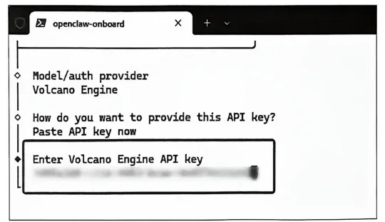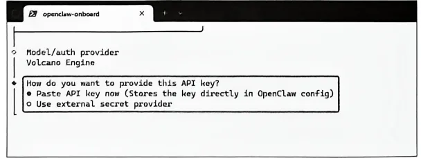 API Key 是你使用大模型的身份凭证,OpenClaw需要通过APIKey,才能调用你账号下的大模型服务。官方提供了两种可选方式,此处我们选择“Paste API key now",按回车键,继续下一步。
