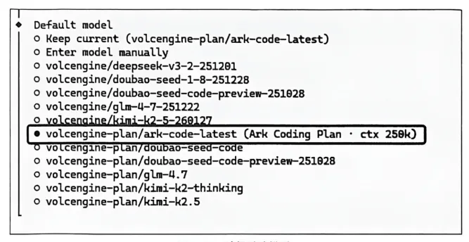 进入默认模型选择界面,通过上下方向键,选中任意前缀为“volcengine-