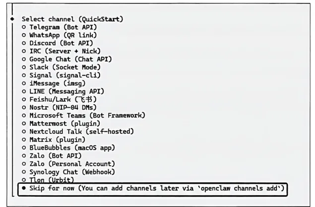 这里的“频道”,指的是OpenClaw可以对接的聊天应用渠道,也就是你后续和OpenClaw对话的入口,包括第三方聊天应用。完成配置后,你就可以直接在这些日常使用的App里给OpenClaw下达指令,无须一直打开终端或网页界面。
