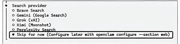 搜索提供商是为OpenClaw提供联网搜索功能的服务方。完成配置后,OpenClaw就可以通过搜索引擎获取实时互联网信息,比如查询最新的航班信息、新闻资讯、实时汇率、天气数据等,完成需要联网的指令任务。