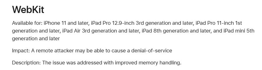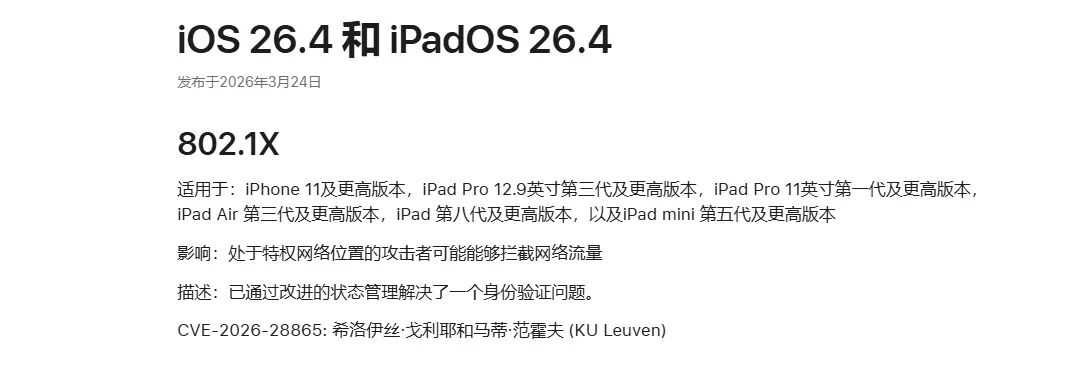 自从 DarkSword / Coruna 漏洞出现后,苹果已经感到有危机感了,为啥这么说,之前提到过,苹果官网发布一条公告,公告就是催促你们升级系统,因存在恶意漏洞,只能通知你们升级,没办法在线修复漏洞。