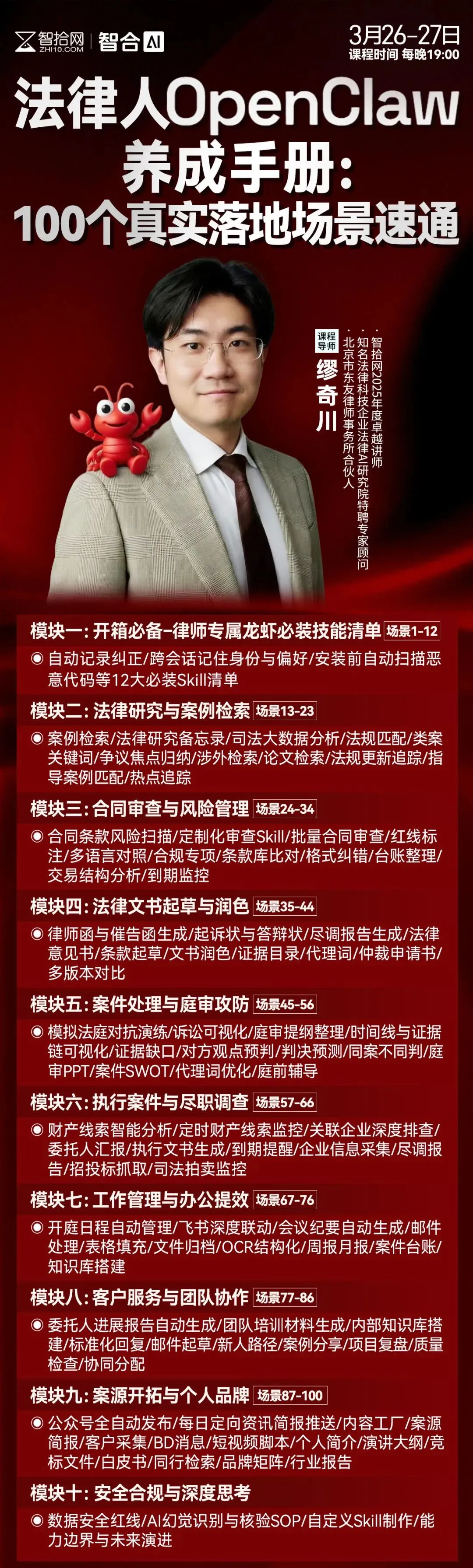 3月26-27日19:00,智拾网邀请到北京市东友律师事务所合伙人、知名法律科技企业法律AI研究院特聘专家顾问缪奇川律师,带来这套专为法律人设计的OpenClaw实战课。