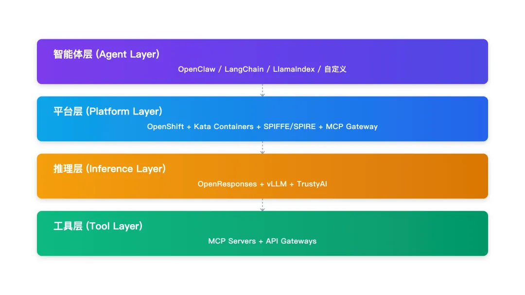 ┌─────────────────────────────────────────────────────────────┐│ 智能体层 (Agent Layer) ││ OpenClaw / LangChain / LlamaIndex / 自定义 │├─────────────────────────────────────────────────────────────┤│ 平台层 (Platform Layer) ││ OpenShift + Kata Containers + SPIFFE/SPIRE + MCP Gateway │├─────────────────────────────────────────────────────────────┤│ 推理层 (Inference Layer) ││ OpenResponses + vLLM + TrustyAI │├─────────────────────────────────────────────────────────────┤│ 工具层 (Tool Layer) ││ MCP Servers + API Gateways │└─────────────────────────────────────────────────────────────┘三、4个致命问题,Red Hat逐一击破