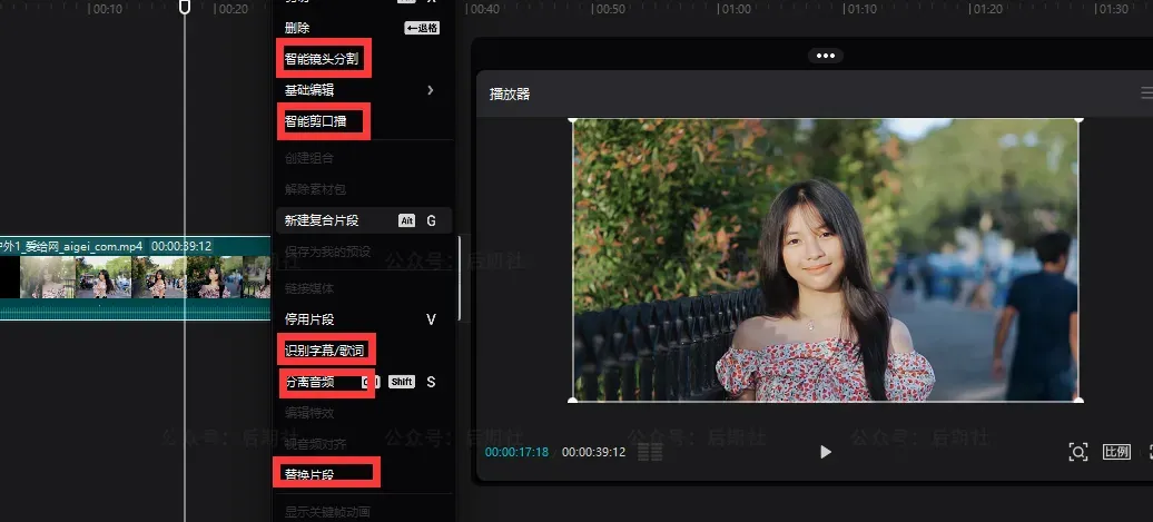 智能镜头分割、智能剪口播、识别字幕/歌词、分离音频等