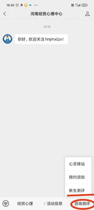 进入公众号,点击最下端“咨询测评”后再点“新生测评”。