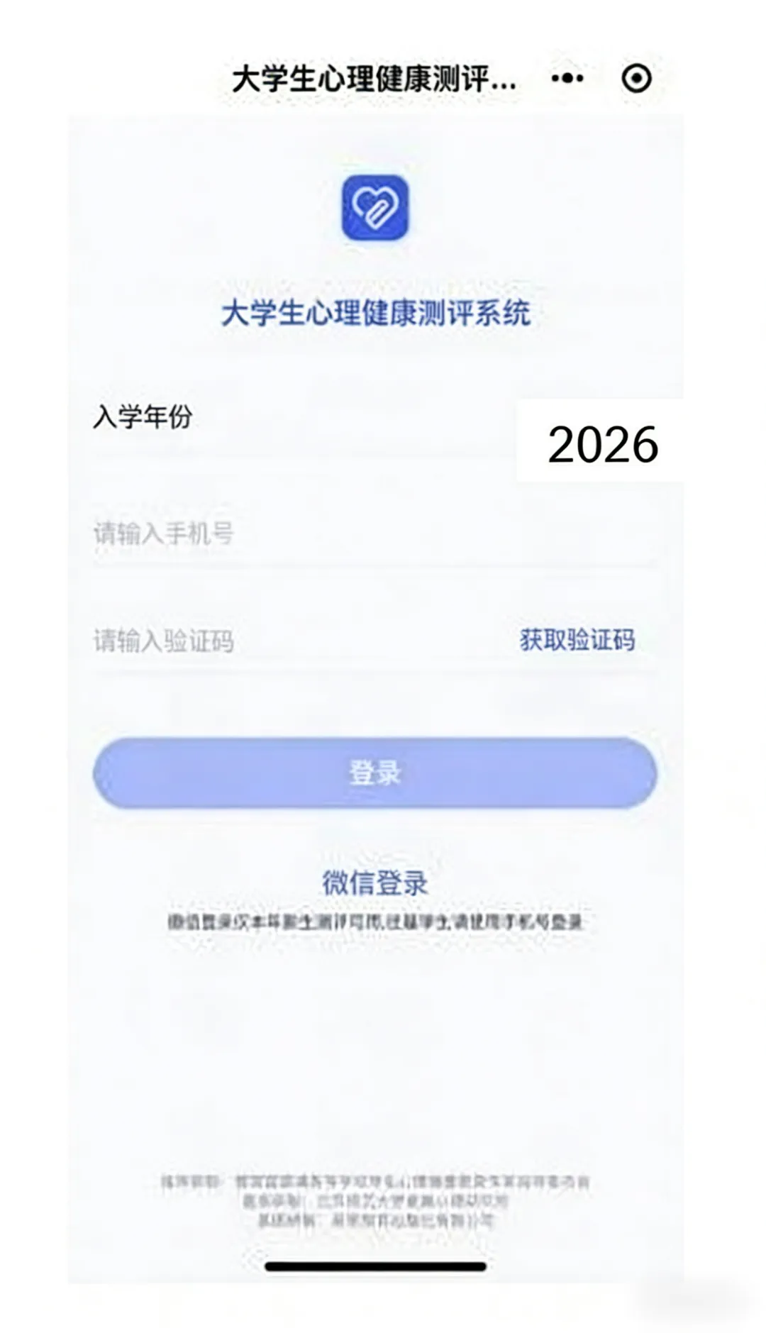 输入手机号,“入学年份,2026”,点击“获取验证码”进行登录。要求手机号和老师导入的手机号一致。