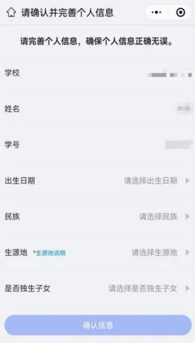 登录后完善个人信息,根据页面提示,完善出生日期、民族、生源地、是否独生子女,确认无误后点击“确认信息”。
