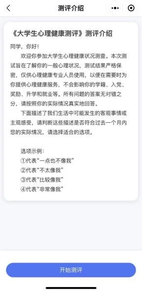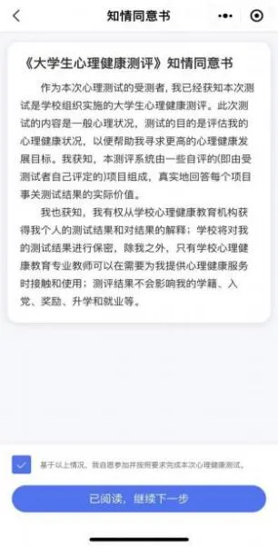 点击“开始测评”,阅读“知情同意书”,勾选“基于以上情况, 我自愿参加并按照要求完成本次心理健康测试”,点击“已阅读,继 续下一步”。