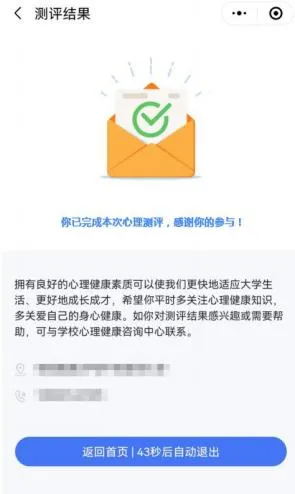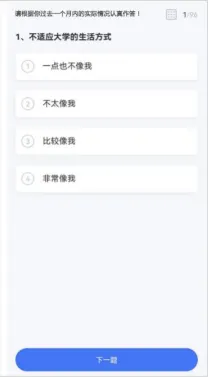 如学生中途退出,再次进入小程序可继续答题,96 道题全部作答,方可提交测评。