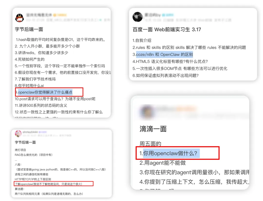 更离谱的是,这把火甚至已经烧到了面试场上,最近不少去面试的同学跟我反馈,面试官已经开始拿 OpenClaw 疯狂拷打候选人了。