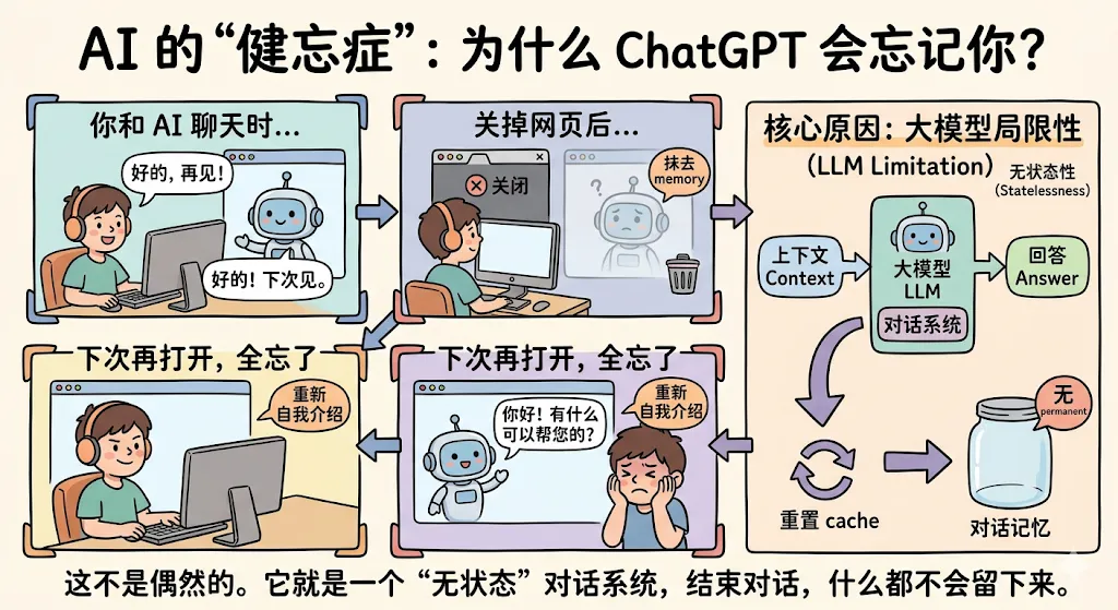 你平时用 ChatGPT 或者其他 AI 聊天的时候,是不是有这种感觉:问完问题,AI 回答你,然后你关掉网页,下次再打开,它就把你们之前聊的东西全忘了。就好像每次见面都要重新自我介绍一样,用久了特别烦。