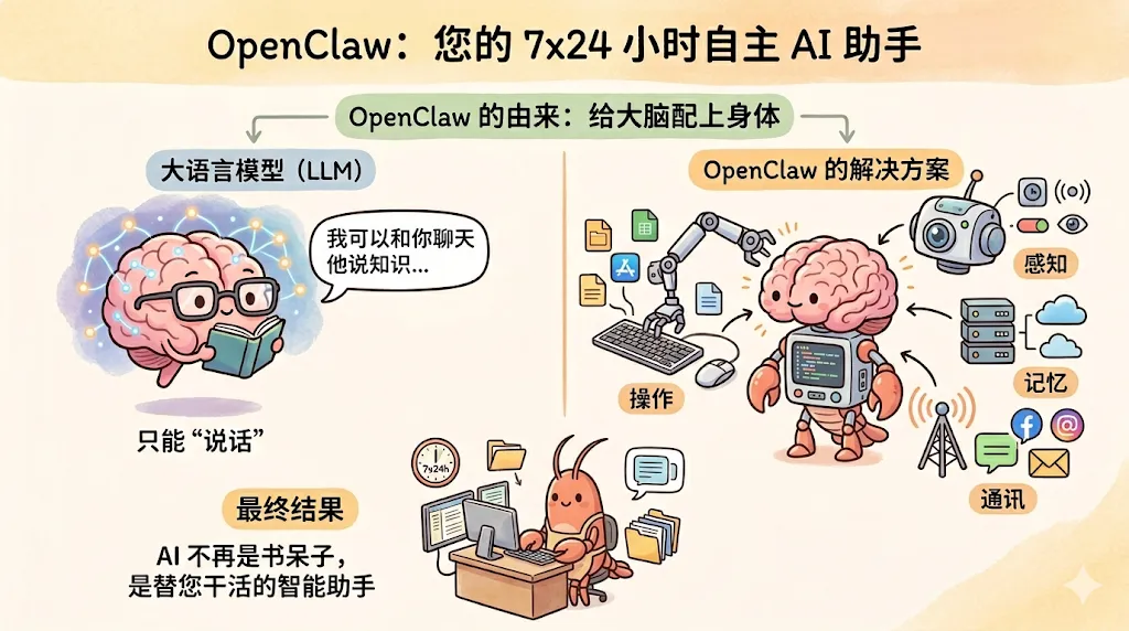 用一句话概括:OpenClaw 是一个可以 7×24 小时运行在你个人设备上的自主 AI Agent,能接管你的电脑帮你干活。
