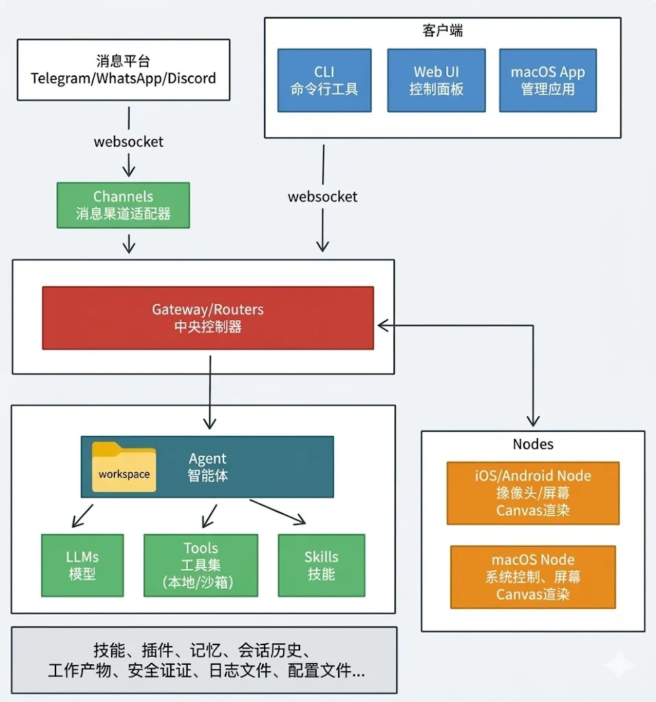 Gateway (网关):你可以把 Gateway 想象成一栋大楼的门卫加总机。所有进入这栋楼的人,都必须先经过它。当你给 AI 发消息的时候,这条消息不是直接就被处理了,而是先到达 Gateway。Gateway 要做三件事:第一,确认你是谁,也就是身份鉴权;第二,管理你当前的会话状态,记录你们聊到哪里了;第三,决定把这个请求转发给哪个组件去处理,也就是路由。 Agent(智能体):本质就是 AI 任务的执行框架,它能调用大模型,不光能听懂你说的话到底要啥,还能把大模型的想法拆解成一步一步可落地的执行计划,协调好各个模块、各种工具资源去干活,全程盯着任务进度,完成之后还会跟你汇报。 Tools 和 Skills(工具和技能):这就是 AI 的万能工具箱,直接决定了它能干啥、不能干啥。Tools 就是单个的基础小工具,比如开个本地文件、发一封邮件、调个软件接口,就像家里的螺丝刀、扳手这种单件工具;Skills 是把好几个工具串起来的一套完整干活流程,比如 “整理项目周报” 这个技能,就是把读邮件、拉进度、写文档、发提醒串起来的一套活。 Channels(通道):这是 AI 的万能翻译官兼对外联络员,我们平时用的飞书、微信、Telegram、这些软件,每个的消息规矩、通信方式都不一样,AI 根本看不懂。它就负责把这些平台的消息,全转成 AI 能听懂的统一内容,也能把 AI 的回复,转成对应平台能发出去的格式,还能一直保持连线不断开,你随时找它,它随时都在,不用你反复开页面刷新。 Nodes(节点):最后是 Nodes 传感器终端。这些是运行在各类设备上的小节点,比如你的手机、苹果笔记本或者台式机。它们为智能体提供摄像头、地理位置、屏幕画面渲染或系统控制等本地级的高权限能力。