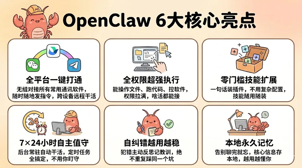 OpenClaw 能够火爆整个开发者社区,核心在于它拥有作为智能体最顶级的六大核心能力,我们来逐一拆解。