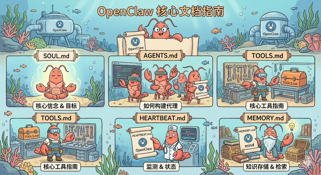 openclaw-workspace/├── SOUL.md├── AGENTS.md├── TOOLS.md├── HEARTBEAT.md├── MEMORY.md└── sessions/ ├── 2026-03-23.md └── 2026-03-24.md这个目录下包含几个各司其职的纯文本 Markdown 文件。我们来挨个盘一盘它们的作用。