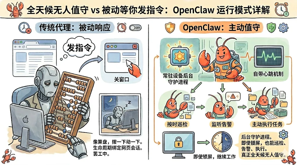 传统 Agent 就像算盘,拨一下动一下,生命周期全绑定在网页会话里。关了窗口就罢工,只能被动等你发指令。而 OpenClaw 是个常驻在你设备上的后台守护进程。它自带心跳机制,哪怕你锁屏了,它也能按时巡检、监听告警、主动执行任务,真正实现了全天候无人值守。